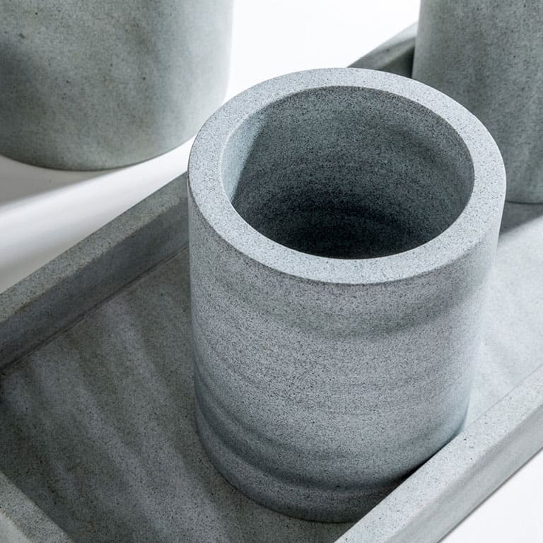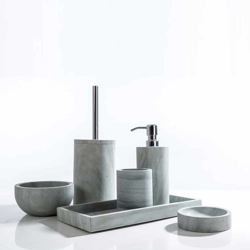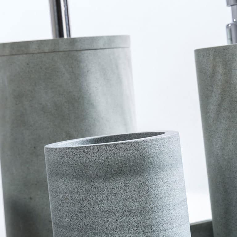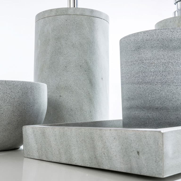Pietra grigia dalle incontrollabili sfumature che virano al verde…. Liscia e perfetta nelle forme. Set completo che aggiunge ai pezzi standard anche la Boule ed il Vassoio. Pompa in ABS cromato e manico scopino in metallo.