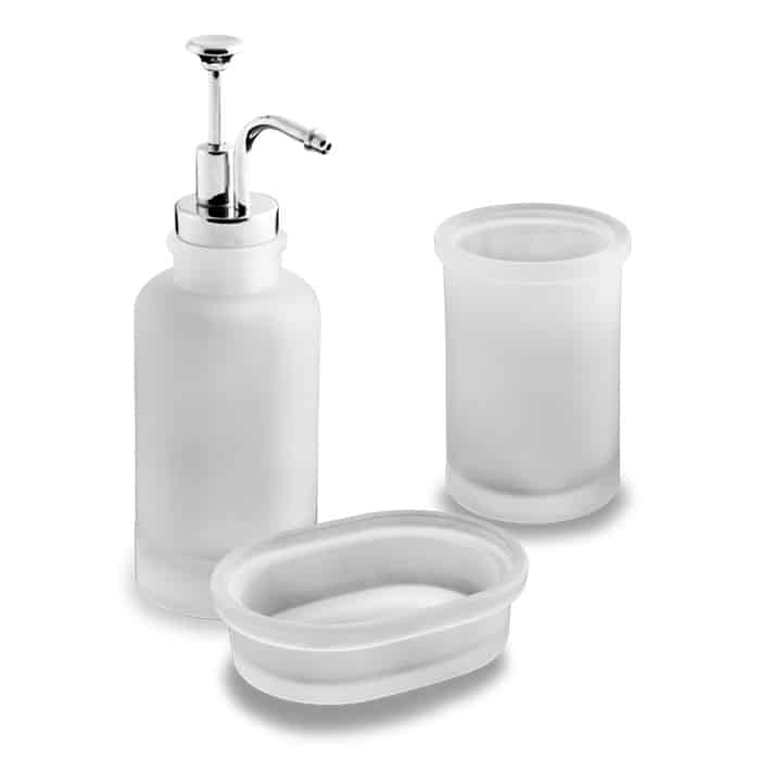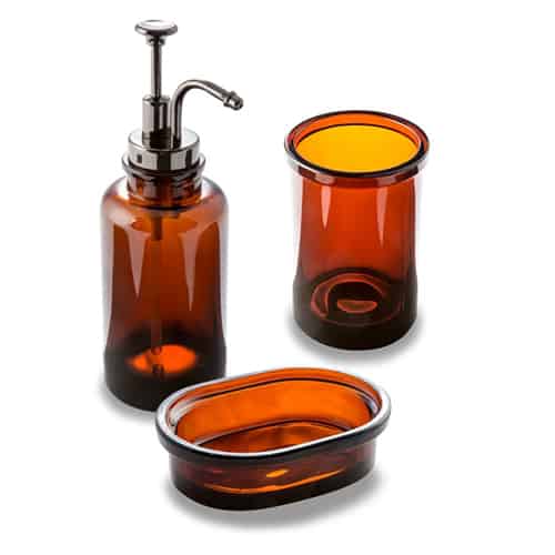 Collezione di accessori disponibile in colore ambrato o satin. Linee semplici e tondeggianti, ma eleganti. Pezzi del set: Dispenser Bicchiere Porta sapone