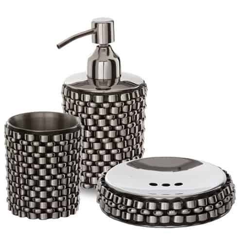 La collezione Cipì Ring è molto particolare. Al suo interno troviamo degli accessori dal design particolare, visto che tutti gli oggetti sono abbelliti da piccoli anelli. Pezzi del set: Dispenser Bicchiere Porta sapone