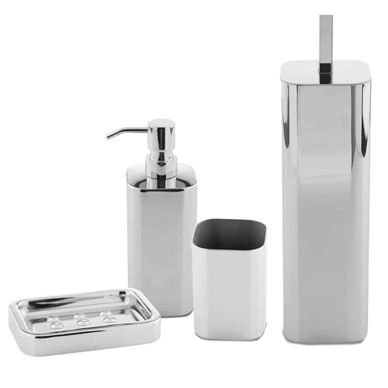 La collezione Cipì Steel è prodotta in acciaio inox cromato, con alto spessore. Pezzi del set: Dispenser Bicchiere Porta sapone Scopino