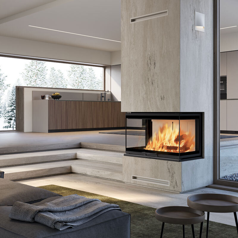 Il focolare a legna Windo3 85 Evo ha una vista spettacolare del fuoco, grazie al vetro su tre lati. Questo design panoramico è l’ideale per chi desidera un tocco di eleganza e funzionalità.