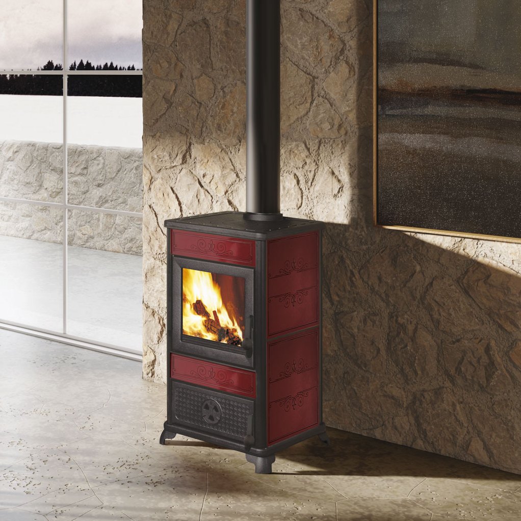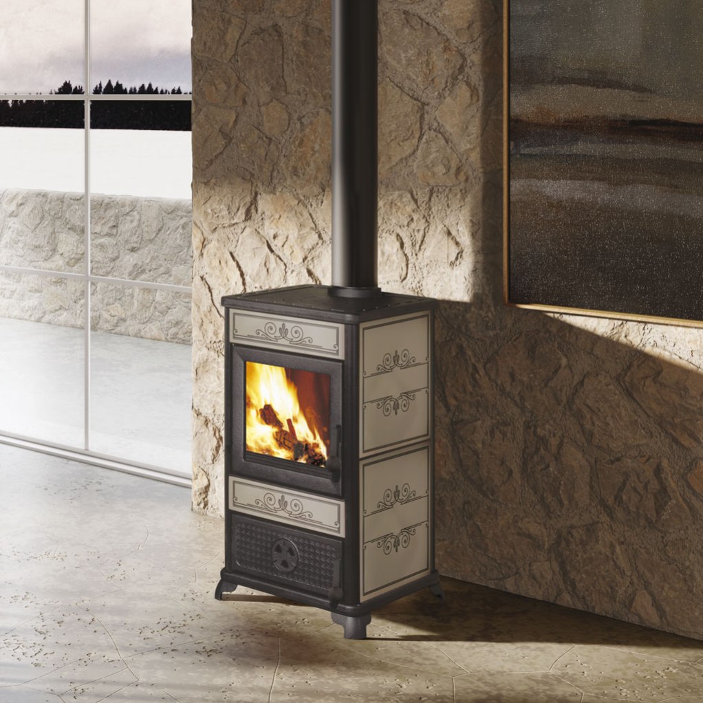 La Fancy Evo è una stufa a legna in stile rustico con fianchi e inserti in ceramica decorata, porta e piedini in ghisa. Il top e il frontale in ghisa smaltata sono dotati pratici anelli asportabili per riscaldare le pietanze.