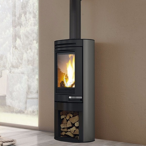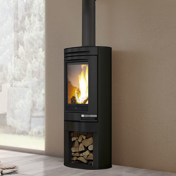 Una stufa a legna dal design moderno e slanciato, dalle linee minimaliste e una superficie liscia. Il vetro panoramico, senza cornici ingombranti, offre una chiara vista della fiamma, mentre il vano portalegna ne garantisce l'efficienza.